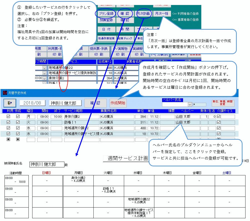 基本登録: 新規利用者の登録と変更、支援事業所の登録修正、サービス事業所登録修正計画作成: サービス計画作成、週間プラン作成と活用