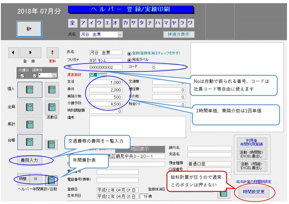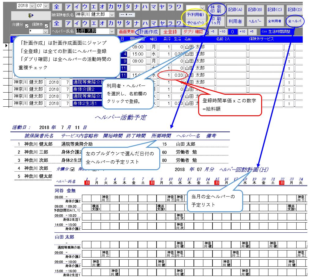 ヘルパー: ヘルパー管理データーの登録、スケジュール表、活動記録書の作成、給料計算