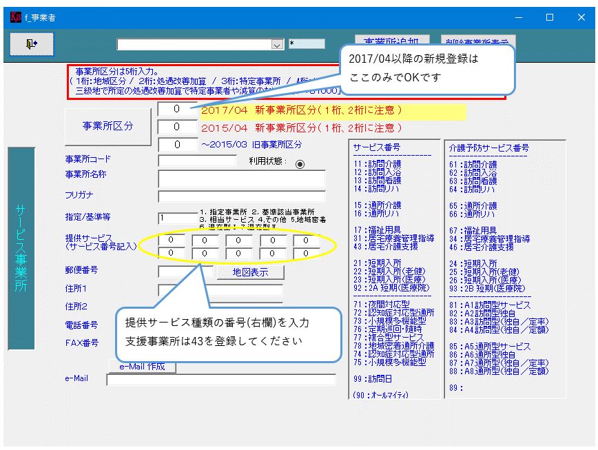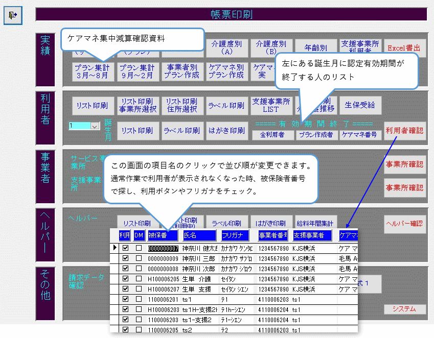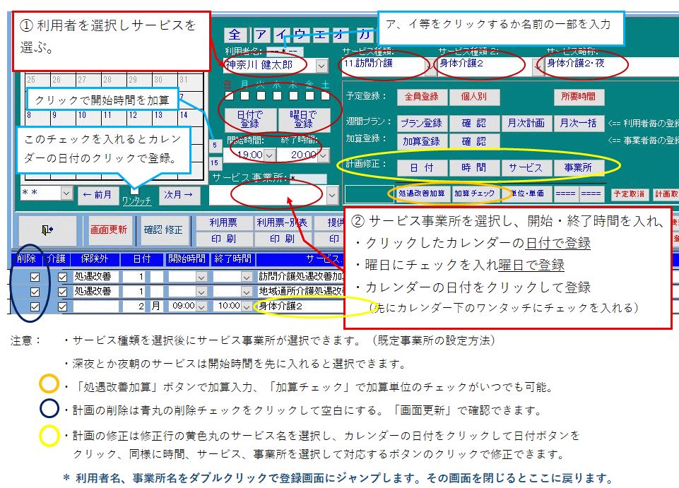 基本登録: 新規利用者の登録と変更、支援事業所の登録修正、サービス事業所登録修正計画作成: サービス計画作成、週間プラン作成と活用
