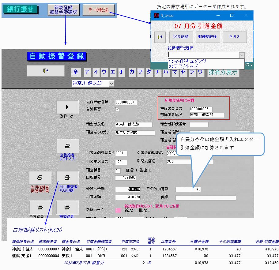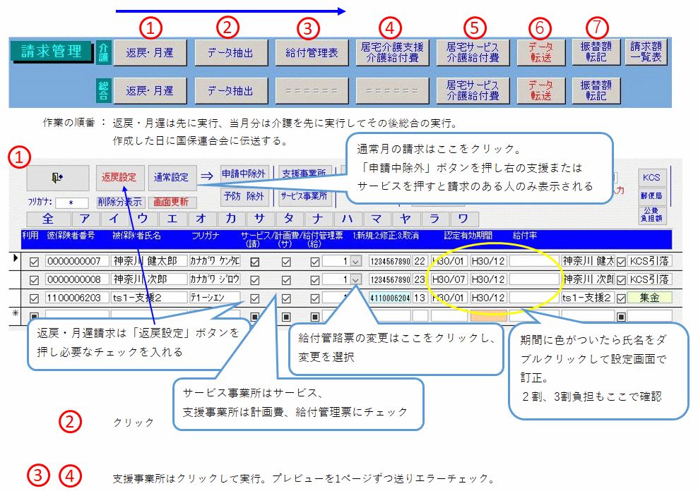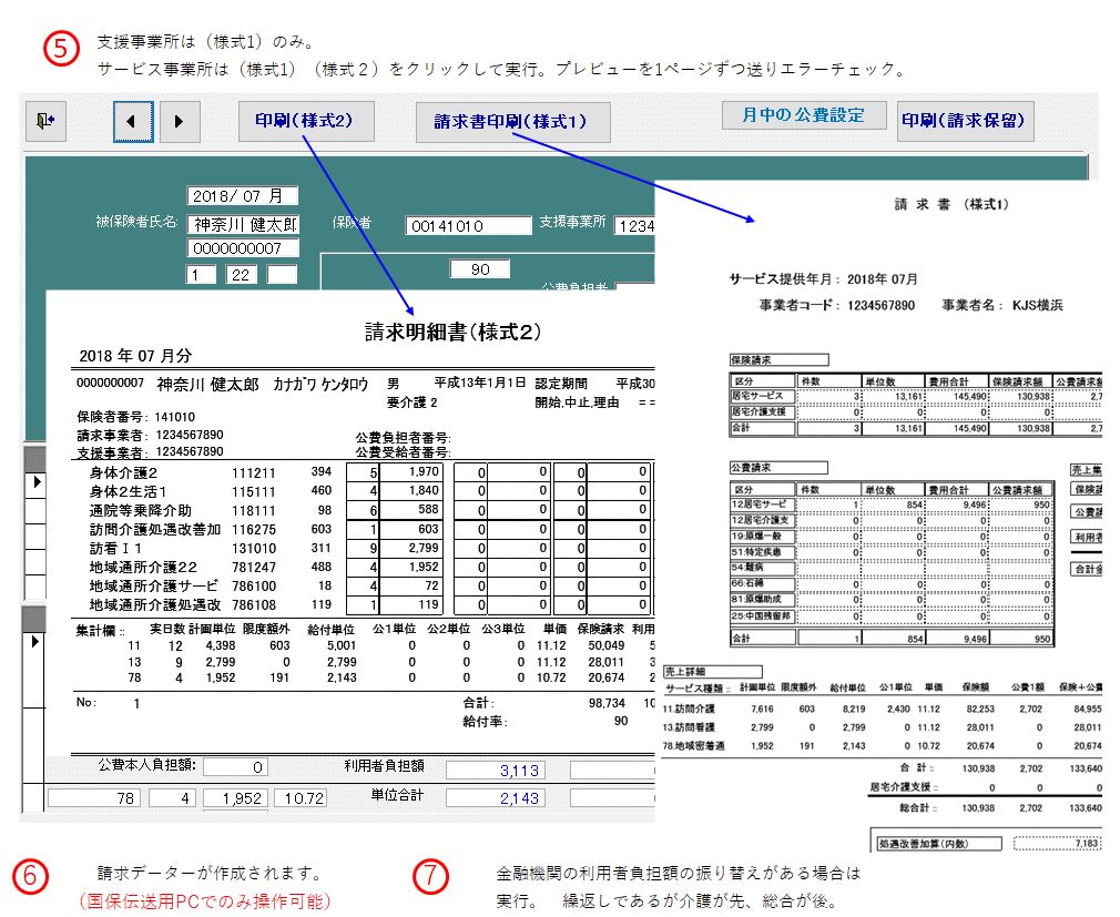 請求処理: 国保請求データー作成作業、利用者請求書、領収書、銀行振替管理データーの作成