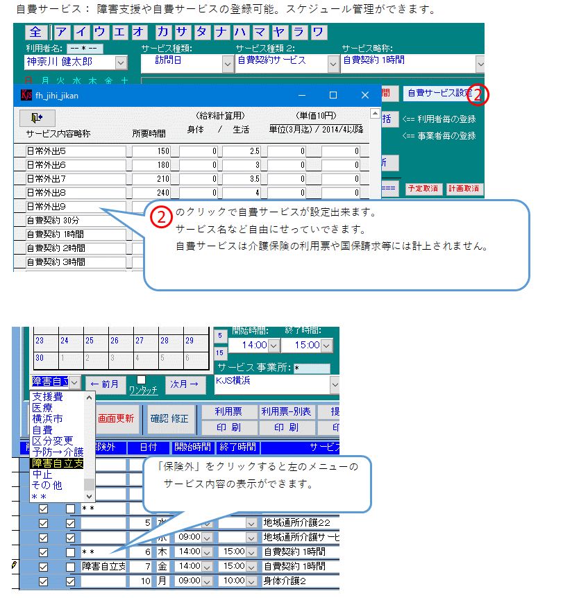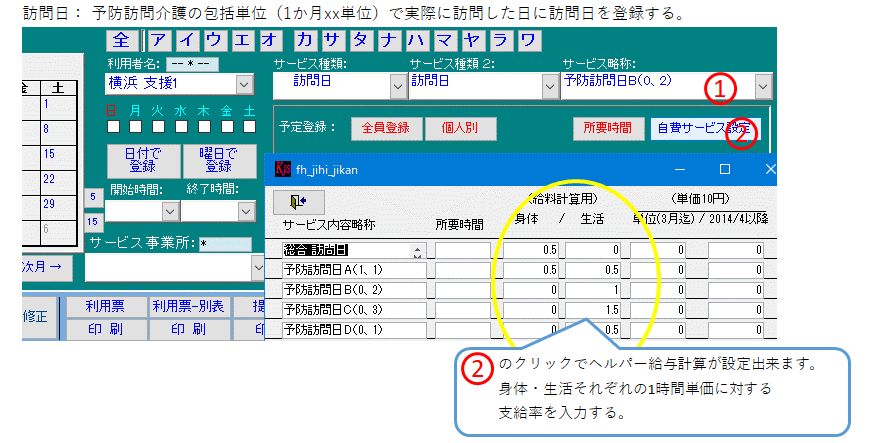 計画作成: サービス計画作成2、訪問日、自費サービス活用、月中での公費適用ヘルパー: 年間給料集計表